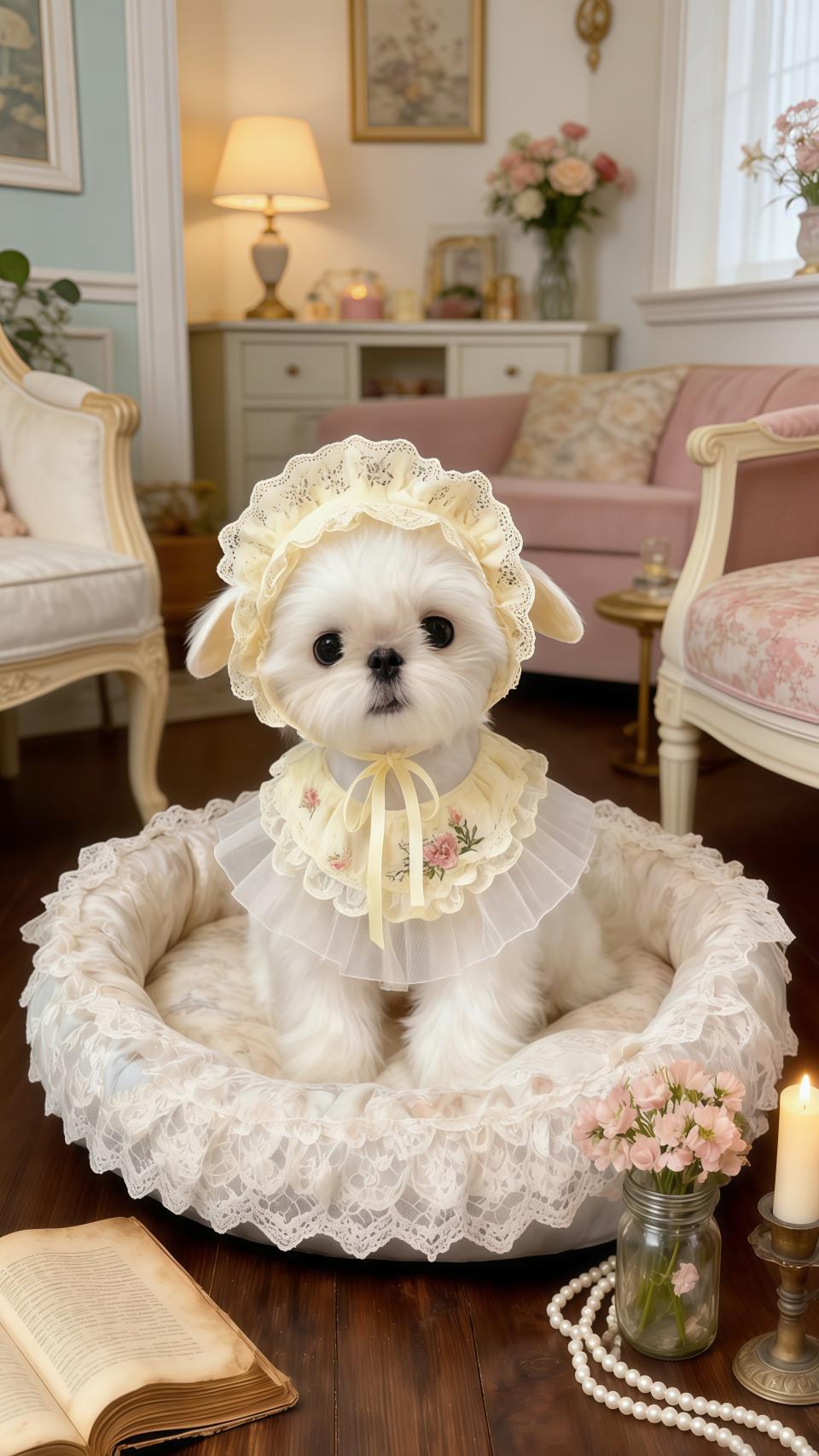 这只软乎乎的马尔济斯,简直是把“精致”刻进了DNA里。奶白色的绒毛蓬松得像云朵,头上戴着米黄色蕾丝软帽,耳边的小绒毛还俏皮地露出来,脖子上系着绣满粉玫瑰的蕾丝围领,层层叠叠的网纱衬得它像从复古油画里走出来的大小姐。乖乖坐在蕾丝狗窝里,圆溜溜的黑眼睛直勾勾盯着镜头,那小表情,傲娇又软萌,谁看了不喊一声“公主殿下”!