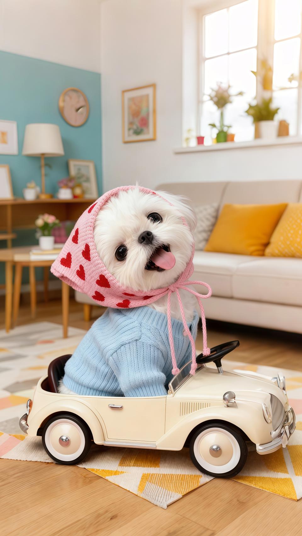 谁能拒绝一只戴着粉爱心头巾、穿着蓝毛衣,开着迷你小汽车的马尔济斯啊!这哪里是狗狗,分明是从甜妹动画里跑出来的小宝贝!