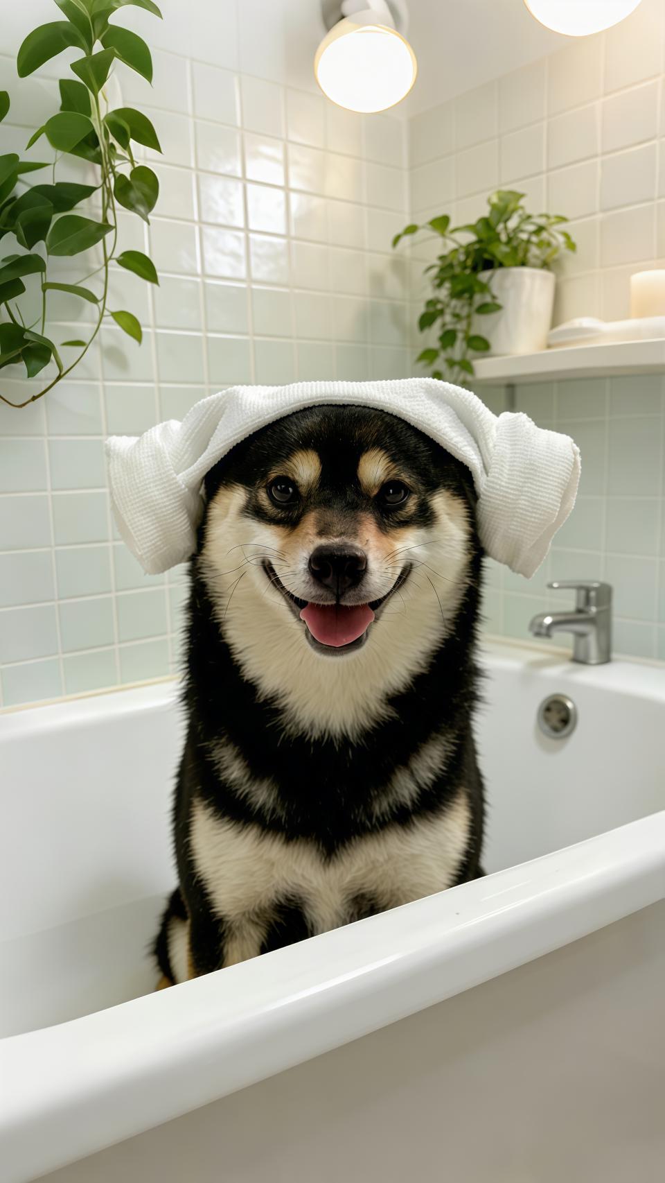 柴犬本身就是表情包界的顶流,这只黑柴更是把“戏精”属性刻进了DNA。黑棕白三色的毛发自带层次感,圆溜溜的眼睛写满了无辜与狡黠,再加上毛巾的神来之笔,直接把“萌”和“搞笑”焊在了一起。它不像别的狗狗洗澡时一脸抗拒,反而像个享受生活的小老板,把洗澡变成了一场沉浸式快乐体验,看得人心情都跟着变好。